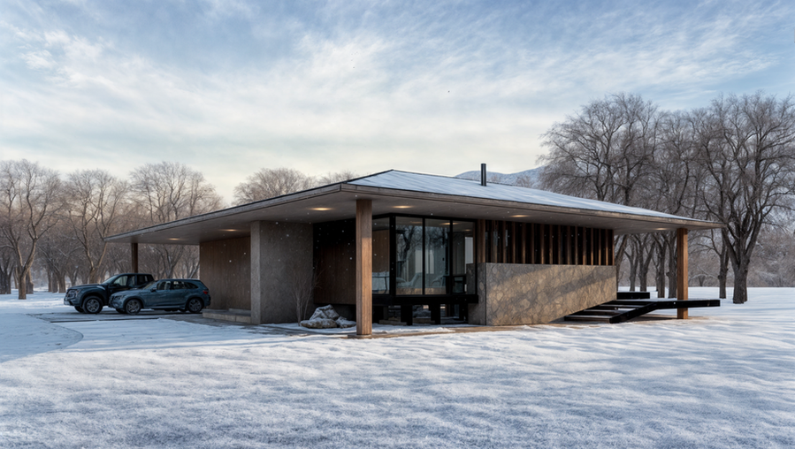 Ubicada en el corazón del Valle Simpson, en Coyhaique, la Casa C/J se concibe como un refugio contemporáneo que dialoga con la naturaleza patagónica en su estado más puro. Su arquitectura de líneas horizontales y techo de gran vuelo abraza el paisaje nevado, ofreciendo protección y abrigo sin perder la conexión visual con el entorno. El uso de piedra y madera otorga calidez y permanencia, mientras que los grandes ventanales abren el interior hacia las vistas cordilleranas, permitiendo que la luz natural y el clima se conviertan en parte de la experiencia habitable. La volumetría se posa sutilmente sobre el terreno, respetando la topografía y destacando una arquitectura que equilibra modernidad, sobriedad y paisaje.